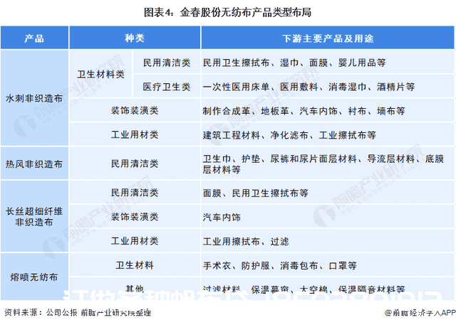 目前,金春股份無紡布產(chǎn)品主要為水刺、熱風、超細纖維、熔噴四大類。其中水刺非織造布材料主要應(yīng)用于衛(wèi)生材料類(含民用清潔類、醫(yī)療衛(wèi)生類)、裝飾裝潢類、工業(yè)用材類三大領(lǐng)域;熱風非織造布主要應(yīng)用于民用清潔類領(lǐng)域;長絲超細纖維非織造布主要應(yīng)用于民用清潔類、裝飾裝潢類、工業(yè)用材類三大領(lǐng)域;熔噴非織造布主要用于衛(wèi)生材料、過濾、保溫用材料等領(lǐng)域。