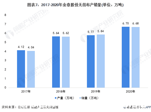 2017-2020年,金春股份無紡布產(chǎn)銷量均呈現(xiàn)增長態(tài)勢。公司無紡布產(chǎn)量從2017年的4.12萬噸增長至2020年的6.70萬噸,銷量從2017年的4.04萬噸增長至2020年的6.68萬噸。
