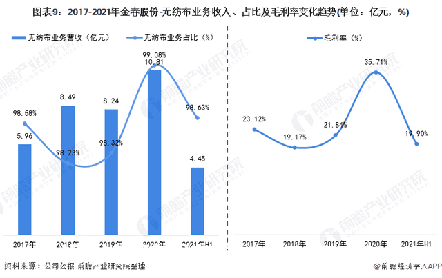 從無紡布業(yè)務(wù)的經(jīng)營情況來看,2017-2020年,金春股份的無紡布業(yè)務(wù)收入穩(wěn)步增長,占總營業(yè)收入的比重保持相對穩(wěn)定。2020年,公司無紡布業(yè)務(wù)營收達10.81億元,占總營收的99.08%。