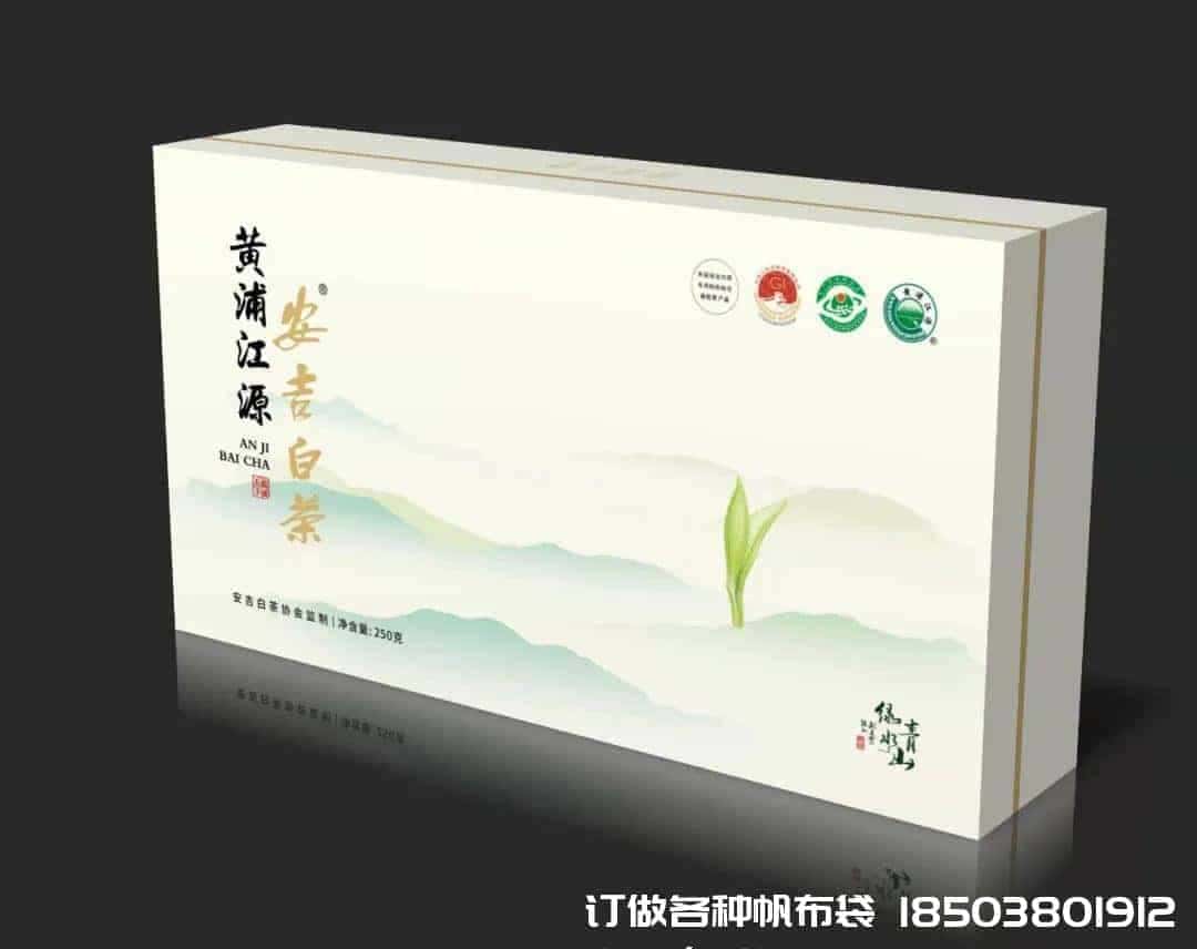 帆布包裝帆布袋制作電話/微信:15838231350白色系為底色,以安吉重巒疊嶂的山為背景,用寫實手法刻畫出“一芽一葉”的安吉白茶,將其葉白脈翠、芽葉飽滿等外觀特征表現得淋漓盡致;芽葉上,清澈明亮露珠順勢而下,畫面清純靈動、色調鮮明。日前,2022年安吉白茶專用新包裝正式推出,其簡潔而不簡單的樣式充分體現了安吉白茶的“純粹”特質。