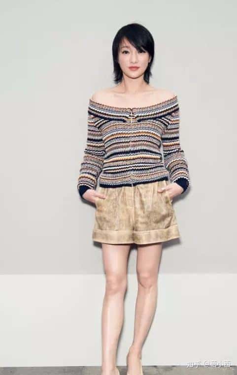 露肩服飾在最近兩年十分受歡迎,尤其是在炎熱的夏天,更是女孩兒們衣櫥里必備的單品,各種露肩的服飾能夠展現出你的鎖骨,還能夠凸顯出性感魅力,又不會覺得低俗,而且周迅的這一件露肩的上衣結合了條紋的元素,也比較時尚和大氣。下半身搭配了卡其色的短褲更是非常的別致,秀出了大長腿,讓人十分羨慕。