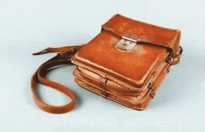 不過,也不是只有軍官才配挎包。還有一個事例,1943年春,魯南軍區三團一個排在抱犢崮西部山區被日偽軍包圍,戰斗持續了將近一天,一名叫劉全的戰士身負重傷。臨終前,劉全吃力地從挎包里掏出一個菜團交給班長。這個事例說明,一些普通戰士也裝備挎包。根據地還有一種人會標配挎包——銀行工作人員,他們表面上是金融系統的員工,其實跟普通戰士沒有什么區別。1940年,冀南銀行的職工們一手拿槍、一手持賬,白天工作、夜間行軍。他們經常背上挎包,帶著賬款,秘密深入農村辦理信貸業務,人們稱之為“挎包銀行”。還有些八路軍軍官的挎包,材質和設計感都比較高級,因為是從日軍軍官繳獲來的。開國上將鄧華是在1937年的平型關戰役中繳獲了日軍公文包,從照片上來看,公文包由皮革制成,日軍中只有兩種人使用皮挎包——軍官和傳令兵。由于這場戰役非比尋常,戰役中繳獲的戰利品自然有不同尋常的意義,因此他格外珍惜這個挎包,一直將它帶在身邊,走過了40多年的漫長歲月。永定河文化博物館中收藏的鄧華將軍的挎包。來源/網絡