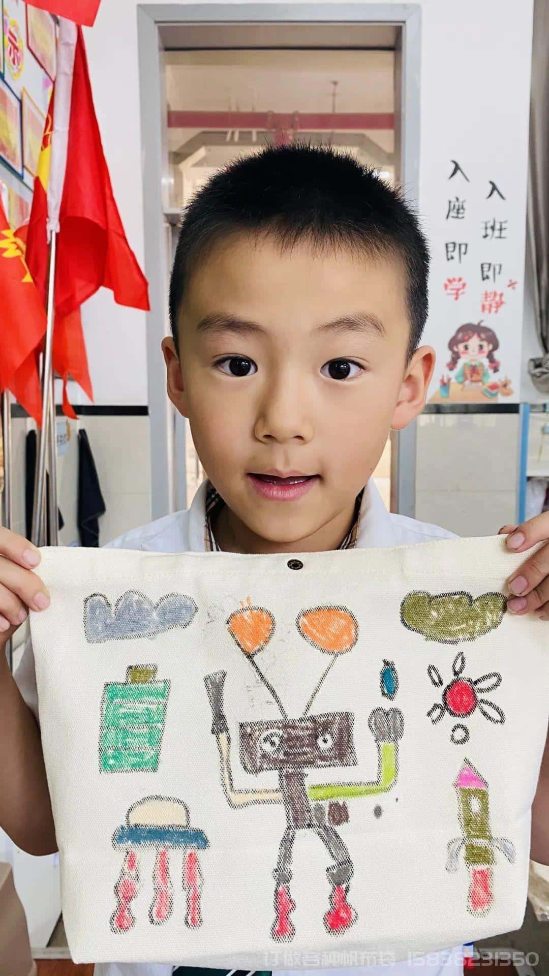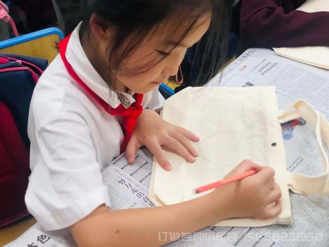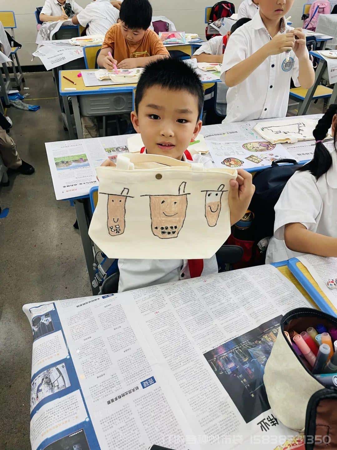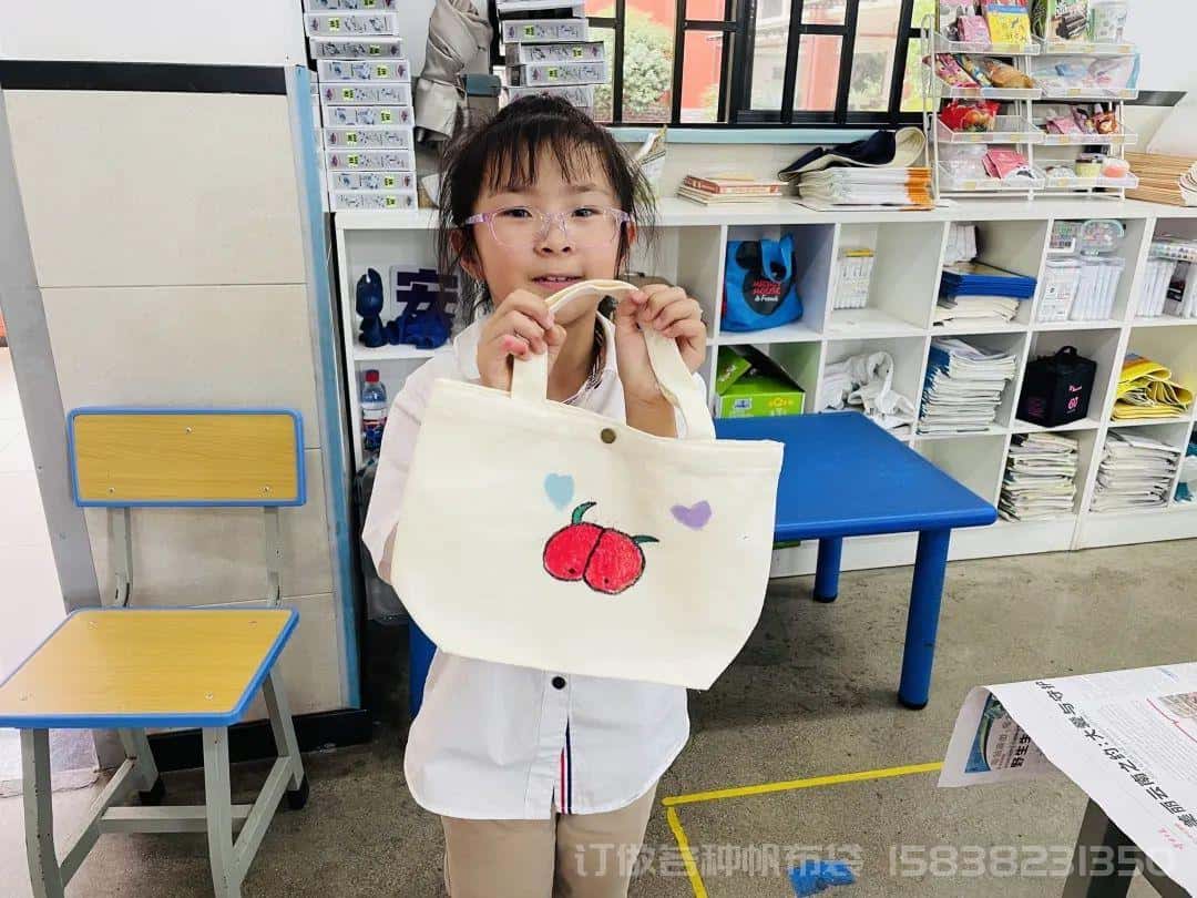 濃郁的藝術氛圍在這里呈現,嶄新的藝術華章在這里譜寫。孩子們神情認真而又愉悅,在帆布袋彩繪DIY中盡情發揮創造,描繪天真爛漫的想象。原本純白的帆布袋,在孩子的筆下,變成一份充滿創造的“勞動成果”,把幸福美好 “袋”回家。