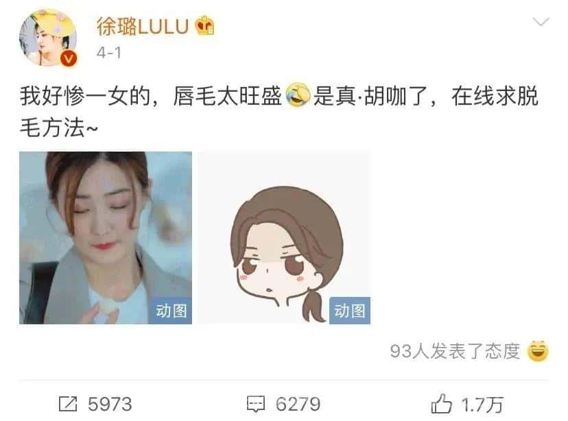 甚至還在微博上自嘲為“胡咖”,向廣大網(wǎng)友求教脫毛方法。