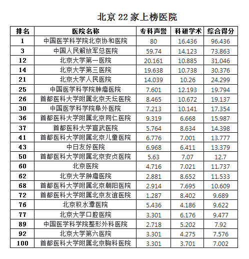11月20日,“復(fù)旦版”《2021年度中國(guó)醫(yī)院綜合排行榜》和《2021年度中國(guó)醫(yī)院??坡曌u(yù)排行榜》發(fā)布,中國(guó)醫(yī)學(xué)科學(xué)院北京協(xié)和醫(yī)院、四川大學(xué)華西醫(yī)院、中國(guó)人民解放軍總醫(yī)院、上海交通大學(xué)醫(yī)學(xué)院附屬瑞金醫(yī)院、復(fù)旦大學(xué)附屬中山醫(yī)院位列綜合榜前五名。北京共有22家醫(yī)院上榜,12家進(jìn)入前50名,42個(gè)??疲ㄇ?0名)上榜。