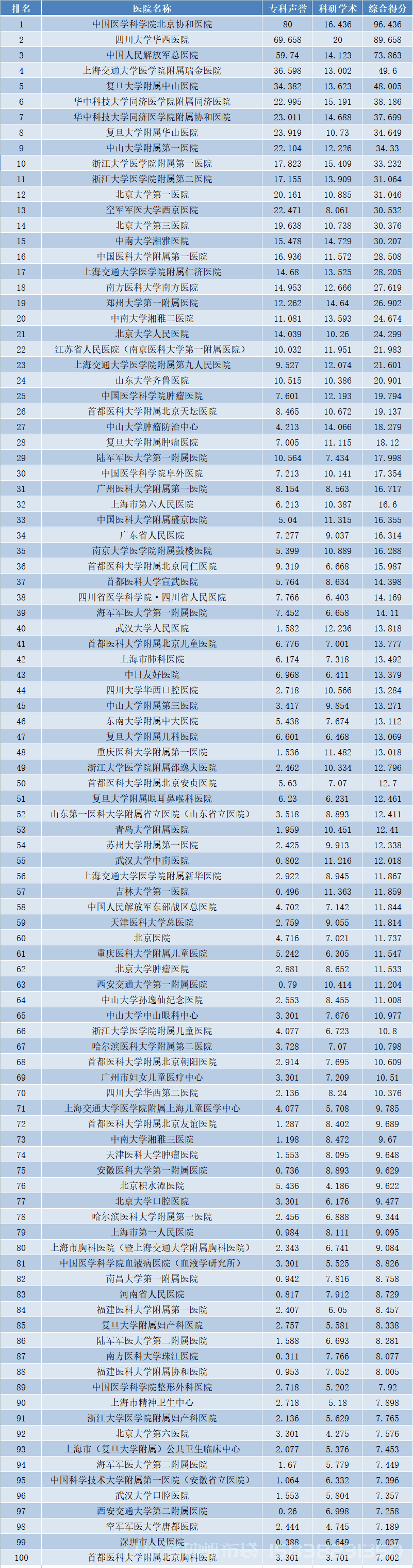 綜合排名:北京協和醫院、華西醫院分別位列第一、第二