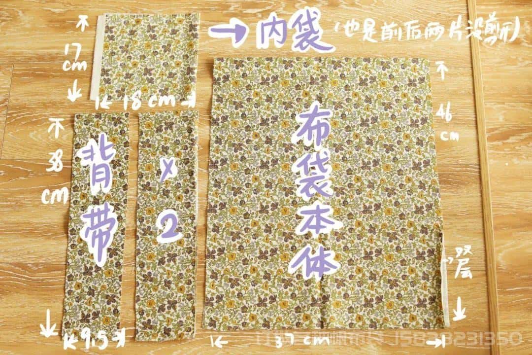 裁剪完成后,你會得到三部分:1??袋子的主體、2??兩層帶子、3??內袋。