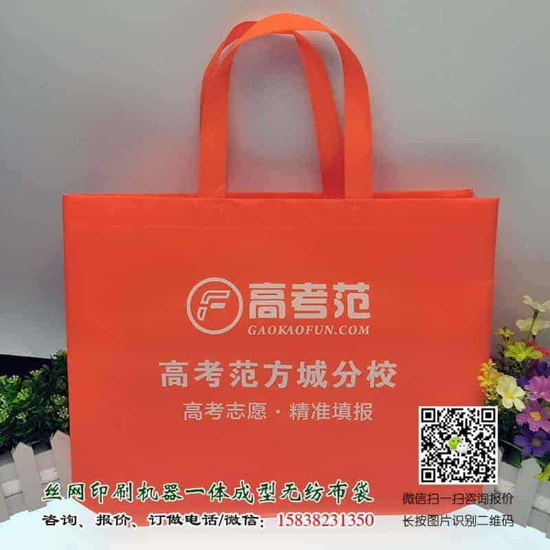 更多的無紡布袋,不只應用在教育培訓班宣傳招生用,更廣泛就用于其它行業。如無紡布打孔袋、無紡布背包袋、無紡布防塵袋、無紡布覆膜袋、無紡布錢包折疊袋、無紡布平口袋、無紡布束口抽繩袋、無紡布門套、無紡布文件袋等款式。在這些無紡布袋上面都可印刷學校、公司、政府等企事業單位的logo及宣傳圖文,即能做廣告宣傳品,又不失實用價值,是各單位企業促銷產品宣傳良好具性價比的選擇。
