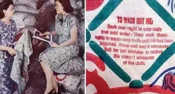 美國經濟大蕭條期間的面粉袋圖案,廠家會貼心地告訴你如何要洗掉墨跡,只留下花布原本的顏色用來制衣。