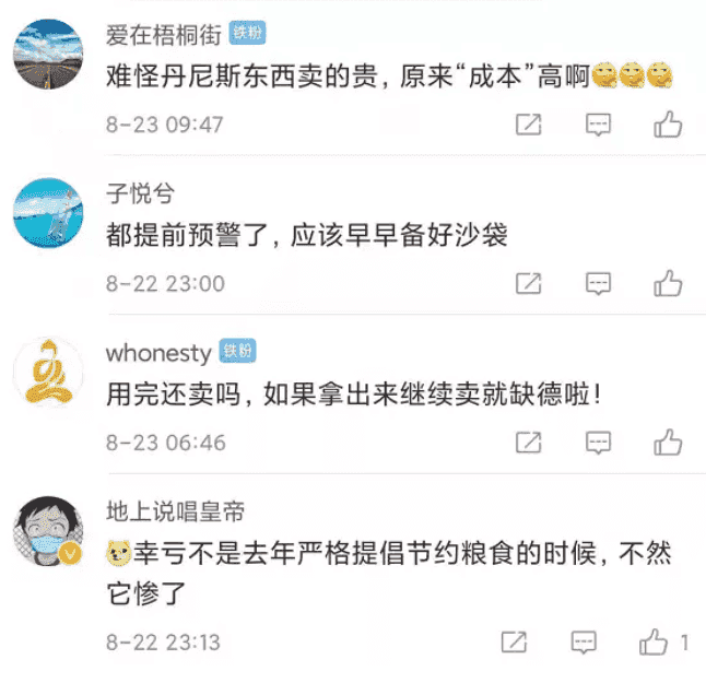 網友紛紛發表看法:“難怪丹尼斯東西賣得貴,原來‘成本’高啊!”“都提前預警了,應該早早備好沙袋。”“用完還賣嗎?如果拿出來繼續賣就缺德啦!”“幸虧不是去年嚴格提倡節約糧食的時候,不然它慘了!”