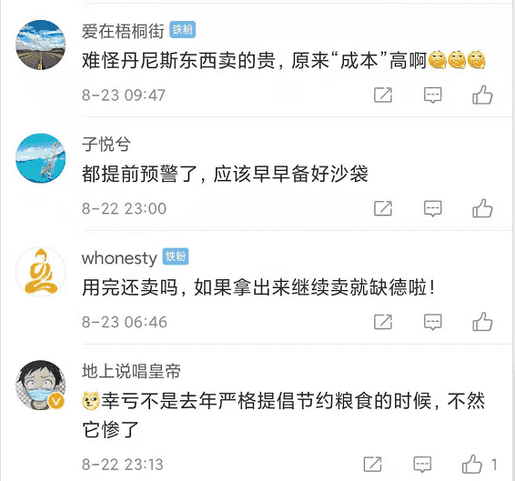網友紛紛發表看法:“難怪丹尼斯東西賣得貴,原來‘成本’高啊!”“都提前預警了,應該早早備好沙袋。”“用完還賣嗎?如果拿出來繼續賣就缺德啦!”“幸虧不是去年嚴格提倡節約糧食的時候,不然它慘了!”