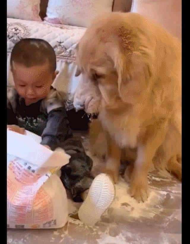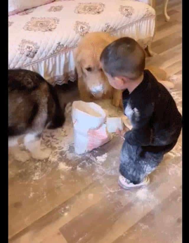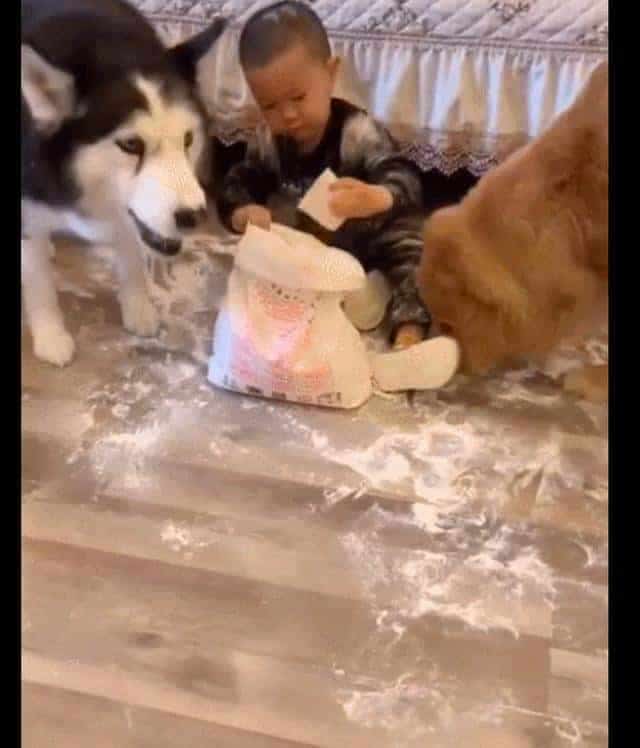 就有這么一位網友,家里養了有兩只狗狗,一只金毛犬,還有一只哈士奇。本來這兩個家伙就夠主人伺候的了,而網友還有個調皮搗蛋的孩子,他們三總是會做一些讓主人哭笑不得的事情。這一天網友睡覺醒來,發現兒子把廚房的面粉給拿出來了,而且還解開了袋子,里面的面粉都撒了一地!
