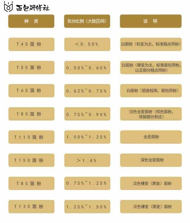 德國粉以“Type+數字”來進行標記和區分,數字的高低代表了礦物質含量的高低。Type812、Type1050、Type1060、Type1150常用于制作面包。其中Type1050與Type1060是全麥面粉,Type1150是黑裸麥粉。
