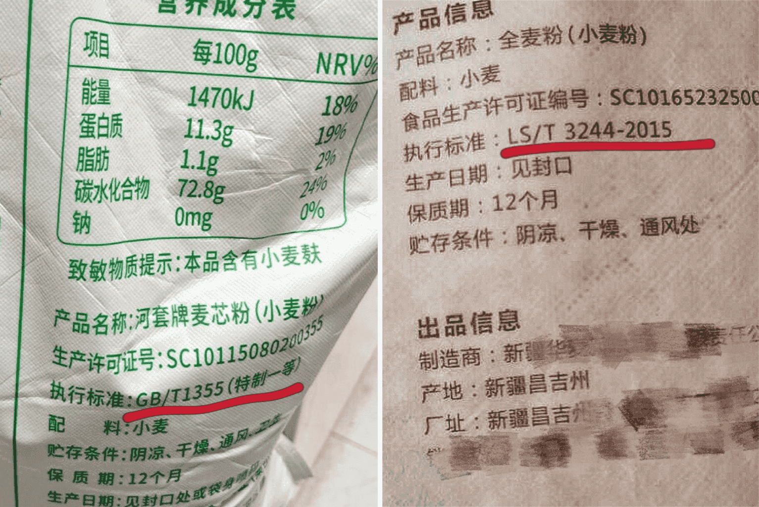 只要是在正規渠道售賣的袋裝面粉,大家留意看下面袋上標注的信息,準能找到它們的執行標準。同樣是面粉,其執行的標準號不同,如下圖,左圖面粉執行的標準是“GB/T 1355”,右圖面粉執行的是“LS/T 3244”,代表的含義也是各不相同的。