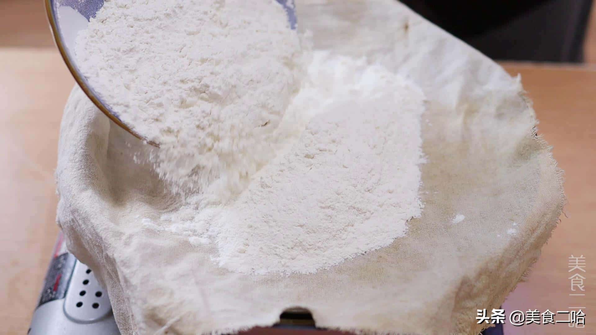2)把普通面粉放在蒸屜上,蒸屜提前要用干燥的籠布鋪上,然后在面粉表面戳幾個小洞洞,上面再覆蓋上干燥的籠布,水開后小火蒸20-30分鐘,然后用搟面杖壓碎,晾干過篩就是低筋面粉。