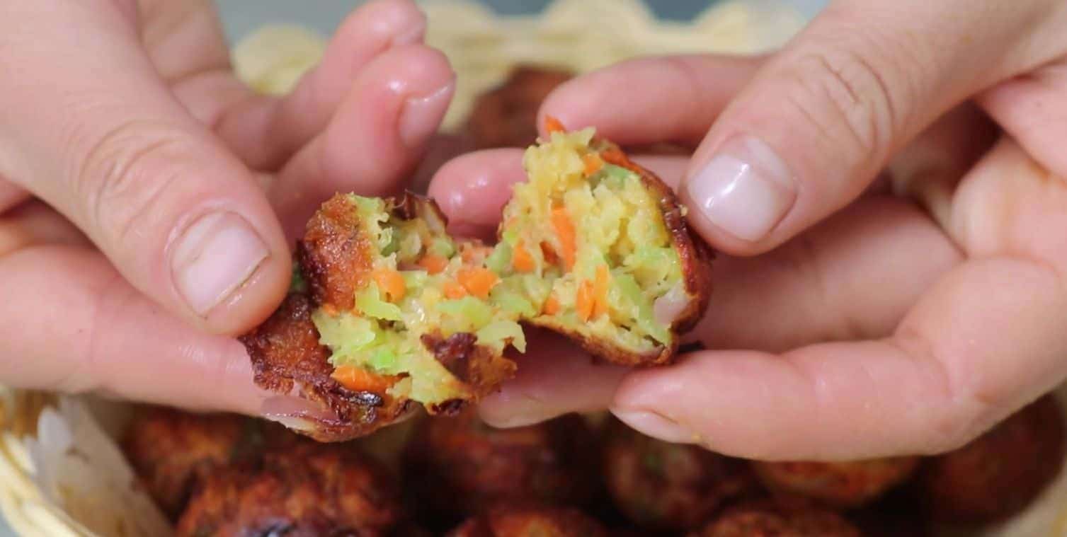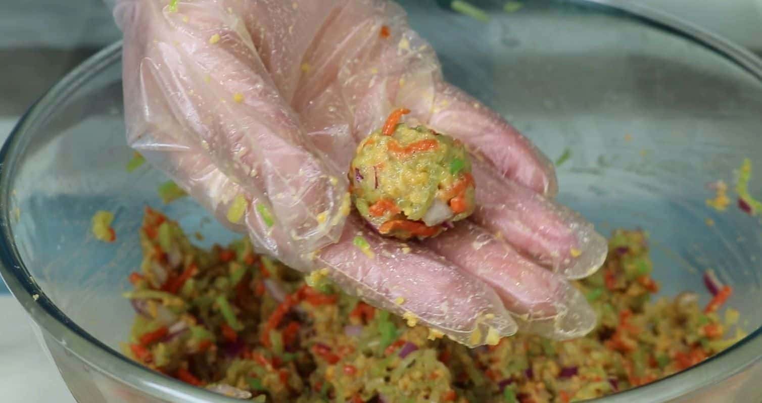 6、將它們抓拌均勻之后咱們再抓上一把餡料放在手中搓成丸子,丸子要稍微小一點,不要太大了,太大了不容易熟。鍋先燒熱多倒上一點食用油,油溫六成熱,將丸子放進去,先不要著急著翻動,等炸至定型之后再不時地推動一下,讓它受熱均勻,炸至金黃酥脆控油撈出,全程大約5分鐘,然后就可以吃了。