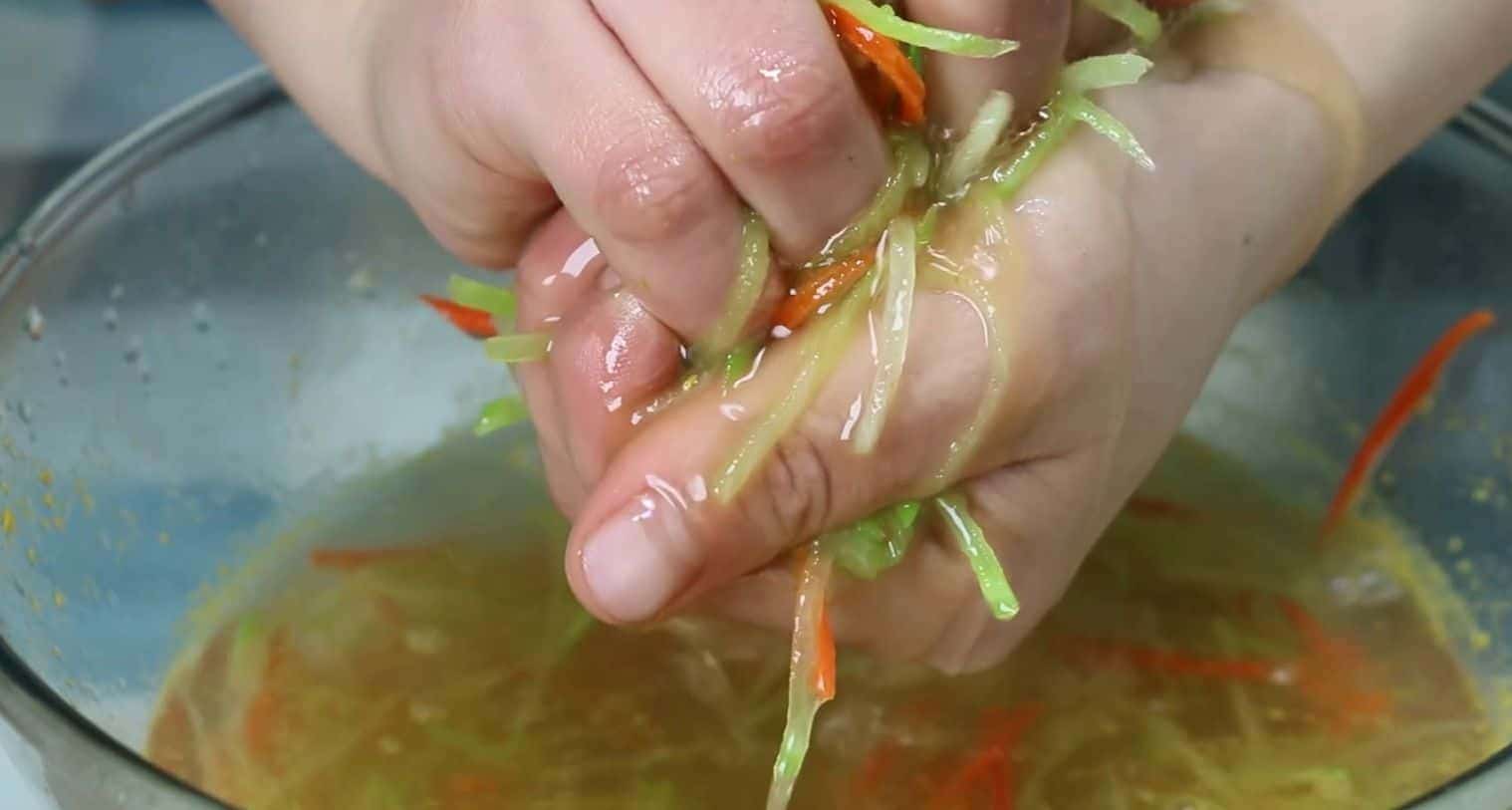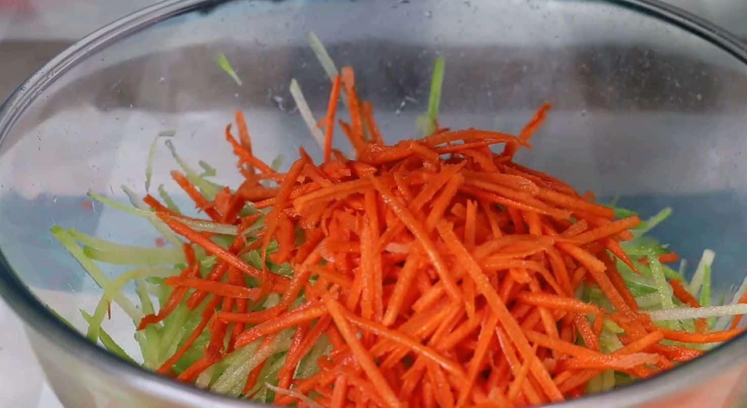 3、將胡蘿卜清洗干凈去皮,然后用擦絲器擦成細絲,擦完細絲之后放到青蘿卜絲中就可以了。在鍋中加入半鍋清水,然后用大火燒開水,等到水完全沸騰了之后放上一勺食鹽,然后把胡蘿卜絲和青蘿卜絲放進去,加入食鹽可以增加底味,而且還可以去除蘿卜的氣味。