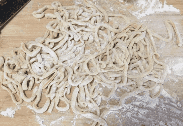第二步:切好之后,用大火將鍋燒干鍋,鍋干后倒入適量的油,等油差不多5成熱時,將切好的長條放入鍋中炸至成形。面條炸成型后撈出瀝干,然后放入盆中備用。把鍋中多余的油倒出放入白糖和水。