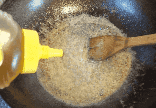 第三步:用中火將糖熬至粘稠粘稠后,再加上適量的蜂蜜攪拌均勻,然后將炸好的面條倒入鍋中翻炒,翻炒均勻之后,將面條塞入容器中壓實,壓好之后,蓋上保鮮膜密封,放在冰箱里冷藏一會兒就可以了。