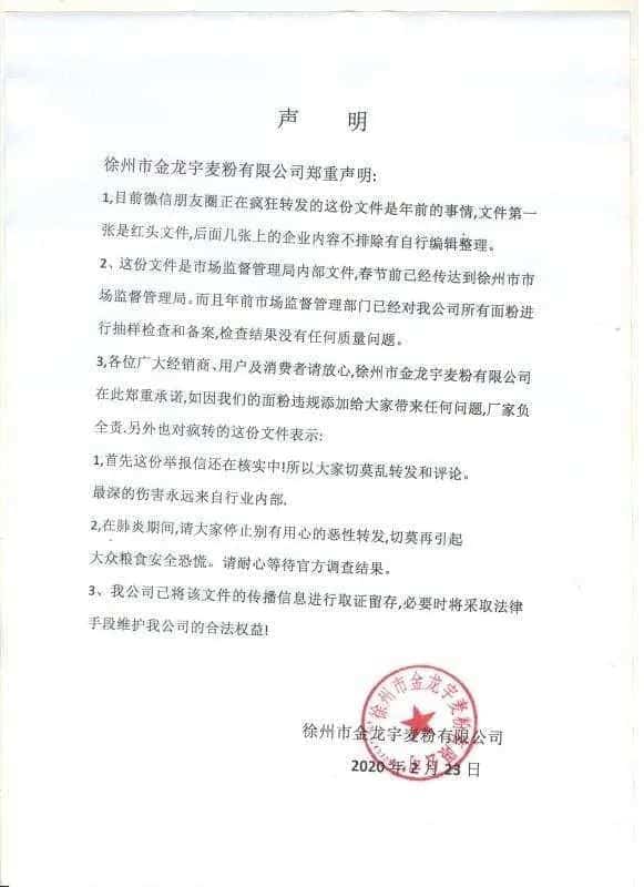 小編仔細閱讀發現內容有多處疑點,與官方用語有所不符,其次我們與多家面粉企業核實文件已是年前的事情,文件中提及到的企業年前已經接受當地市場監督管理局的檢查和備案,沒有任何質量問題!