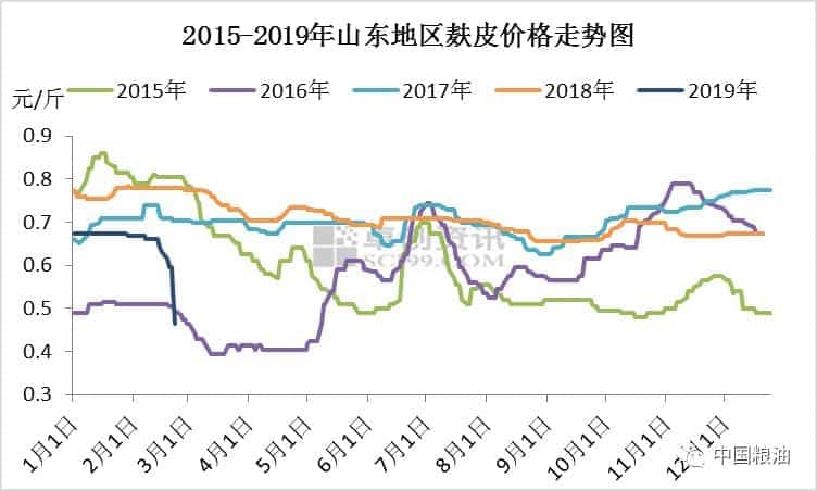 我們通過近6年山東地區麩皮價格走勢圖可以看出,目前麩皮價格已經逐漸向2016年的最低價格靠近。2016年市場最低價在3月中旬的0.39元/斤,目前的價格只有很短的距離,那么后期麩皮價格仍將維持急速下跌還是會趨穩,是否存在反彈的機會,我們對后期市場展開分析。