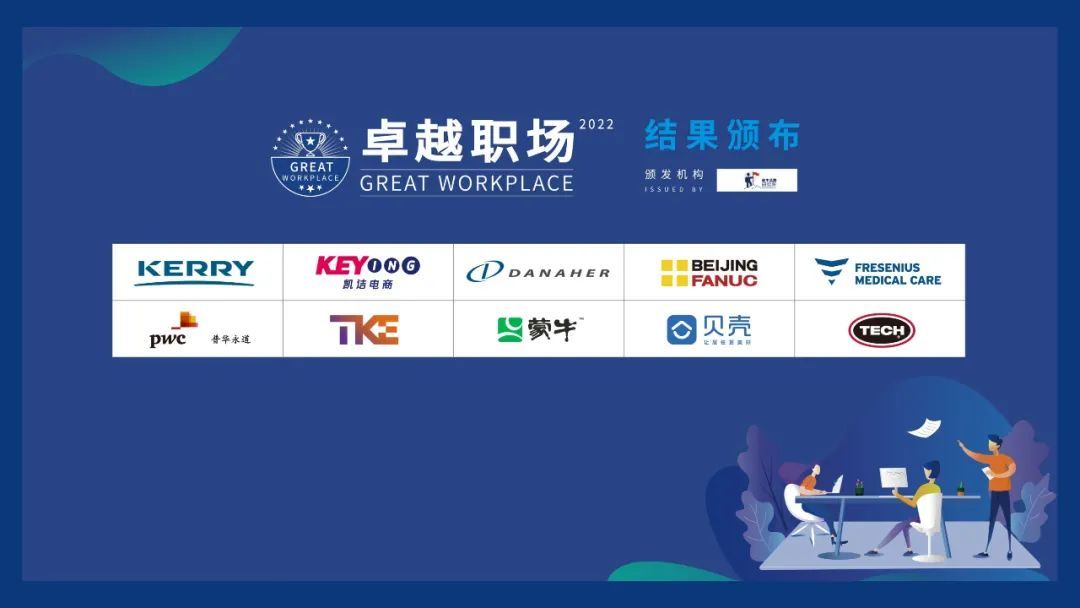 “2022卓越職場”(GREAT WORKPLACE 2022) 專家委員會基于2大審度維度,5項評選標準,歷經了科學的遴選。最終,凱愛瑞中國、凱詰電商、丹納赫集團、北京發那科、費森尤斯醫療、普華永道、蒂升電梯、蒙牛、貝殼、泰克國際這10家領先企業成功摘取桂冠,以此表彰他們在職場建設中所取得的成就。這10家企業重新定義了職場的標準,推動了職場文化的發展與進步。在2022年,本項評選通過企業將被授權使用“2022卓越職場” (GREAT WORKPLACE 2022)標志。