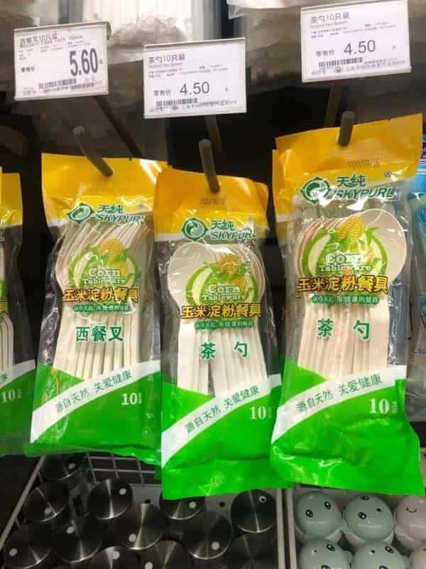 貨架上的一次性餐具也被玉米淀粉餐具取代