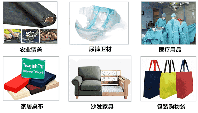 Spunbond non-woven fabric is mainly used for medical health materials, agricultural coverage, home textile & household products, packaging materials, shopping bags and other aspects. New products emerge in an endless stream and are widely used.10~40gsm用于醫療衛生用品,如口罩、醫用一次性隔離服、頭套、鞋套、紙尿褲、成人尿失禁及衛生用品等 ; 17~100gsm(3%紫外線)用于農業覆蓋,如作物覆蓋地被、根控袋、種子袋、除草墊,苗圃保護套、保溫簾、地面防護等; 15~85gsm用于家紡內襯,如沙發內襯、床墊彈簧包、家具內襯、一次性床單、枕套、房屋管道包裝材料、屋頂和瓷磚墊層、隔音天花板、地墊復合材料、絕緣材料等; 40~120gsm用于家居用品,如衣柜、儲物盒、桌布、防塵罩、墻紙、日歷等;50~120gsm用于包裝材料,如購物袋、西裝套、禮品袋、茶包、大米面粉袋、花材包裝等;100~150gsm用于百葉窗、汽車內飾、攝影背景布、廣告布等。6