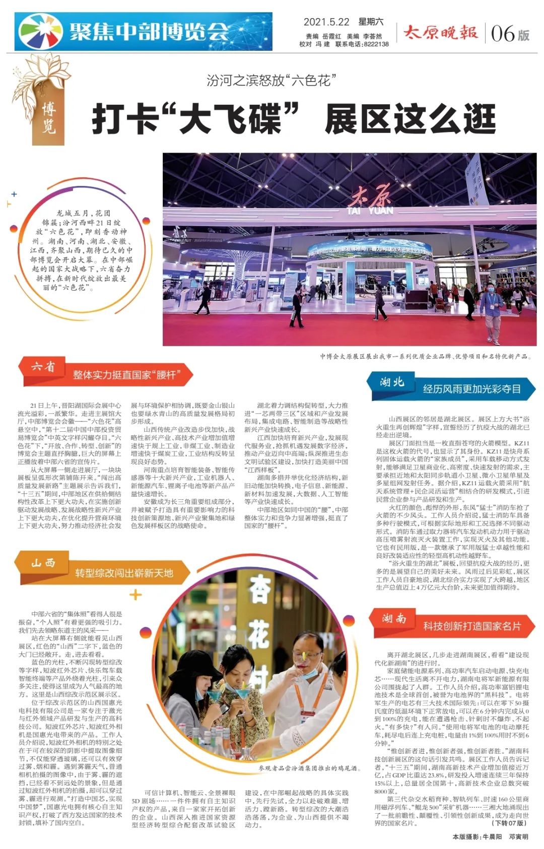 六省展區,令人流連。中部崛起,值得期待。在今年3月發布的國家“十四五”規劃和2035年遠景目標中明確提出,要開創中部地區崛起新局面,推動中部地區加快崛起。六省聞令而動。今年以來,六省新興動能快速增長,高技術制造業或高新技術產業增加值全部實現20%以上強勁增長。一季度,中部六省的地區生產總值達5.4萬億元,同比增長22.4%,增速超過全國平均水平4.1個百分點,呈現出強勁反彈、接續向好的勢頭。在國新辦為本屆中部博覽會舉行的新聞發布會上,商務部副部長王受文表示,3月30日,中共中央政治局會議審議了《關于新時代推動中部地區高質量發展的指導意見》。中部地區作為全國大市場的重要組成部分和空間樞紐,要找準定位,發揮優勢;要著力推進內陸高水平開放;要把創新作為引領發展的第一動力,堅持綠色低碳發展新路。這可以說為中部地區高質量發展指明了方向,提出了更高的要求,對中部地區發展具有里程碑的意義。中部博覽會,展現的是現實,憧憬的是夢想。在中部崛起的新征程上,六省攜手前行,高質量發展之路必將越走越寬廣。“獨行快,眾行遠。”中部崛起,不止是夢想。太原晚報記者 何寶國牛晨陽 鄧寅明 攝打開名片關注▼往期精彩內容▼