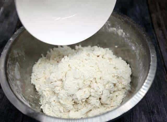 1,500克高筋面粉倒入面盆中,加入20克豬油,然后分多次加入250克開水,邊加開水邊用筷子攪拌。